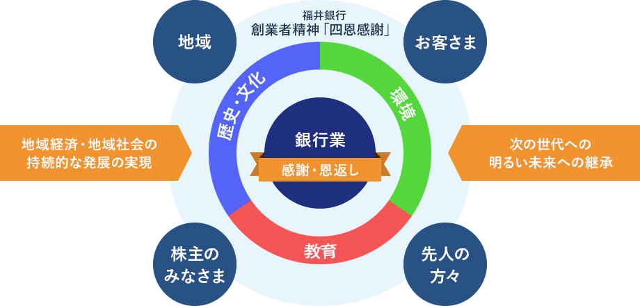 この「四恩感謝」の精神に則り、これまで当行を支えていただいた地域社会に深く感謝するとともに、地域社会の持続的な発展に向けて恩返しをさせていただくことが福井銀行のCSRであると考えています。