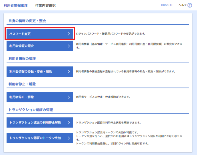 「業務選択」画面が表示されますので、[利用者情報管理]ボタンをクリックしてください。