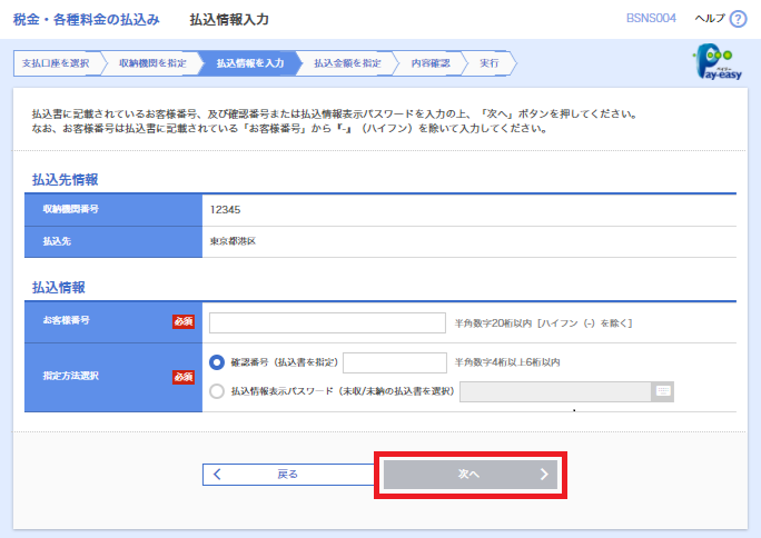 払込書に記載されている収納機関番号を入力し、[次へ]ボタンをクリックしてください。