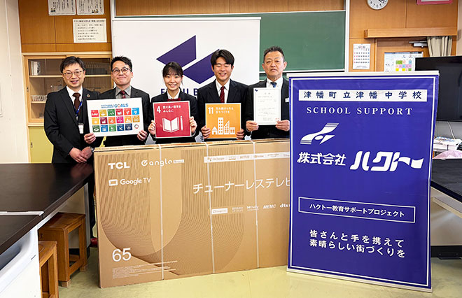 今回は、事業を通じてご縁のある津幡町立津幡中学校の生徒の皆さまへ「これから地域を担う子供たちの教育に貢献したい」という思いから、学習に必要な機材として「チューナーレステレビ、壁付金具」を寄贈されました。