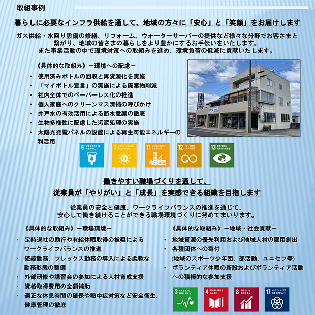 お客様の生活を支える責任を感じながら、 「お客様・お取引先・弊社社員」弊社に関わる方、皆様が幸せになれるよう、日々努めてまいります。 |
