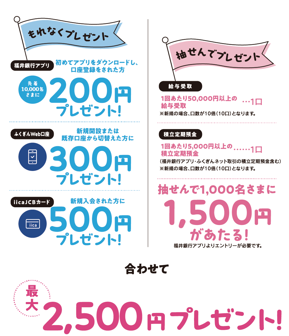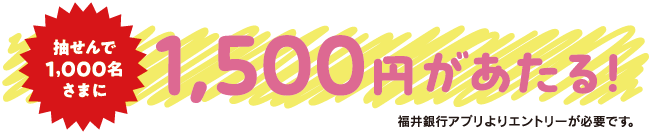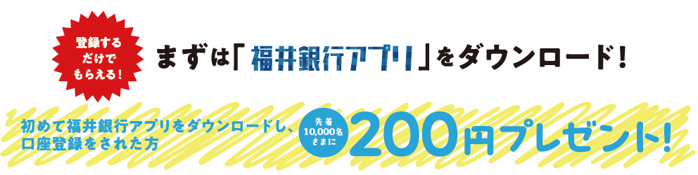 福井銀行アプリをダウンロードし、初めて口座登録をされた方※1 | 先着10,000名さまに200円 |