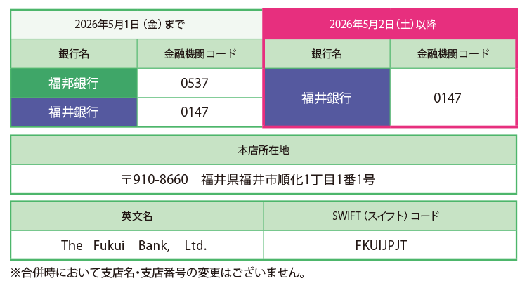 また、「新銀行名・新金融機関コード」でのお振込みは、合併日(2026年5月2日)以降としていただくよう併せてお伝えください。